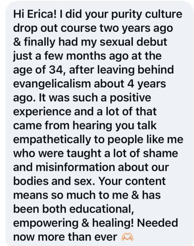 I developed the Purity Culture Dropout™️ Program to help people learn all of the sex education that they missed growing up in purity culture- sex ed that is accurate, queer inclusive, trauma informed, compassionate, and comprehensive. I have worked with hundreds of people to help them learn about healthy sexuality after high control religion. Subscribe if you're curious about / invested in shame free sexuality education that's specifically tailored to the needs of people coming out of high control religions and purity culture. Expect information not just about healthy sexuality and upcoming programming, but also cultural commentary on sexual politics in the US. I'm a sex educator with 25 years of experience and I'm excited to share that with you.